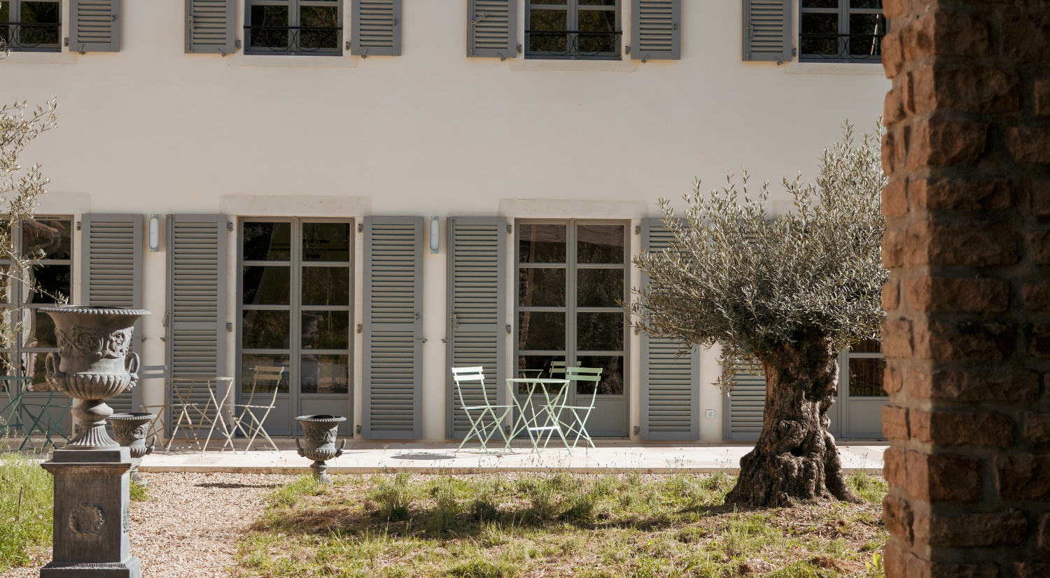 Le Château s’organise autour d’une cour centrale en gravier, ponctuée d’un bassin ancien.